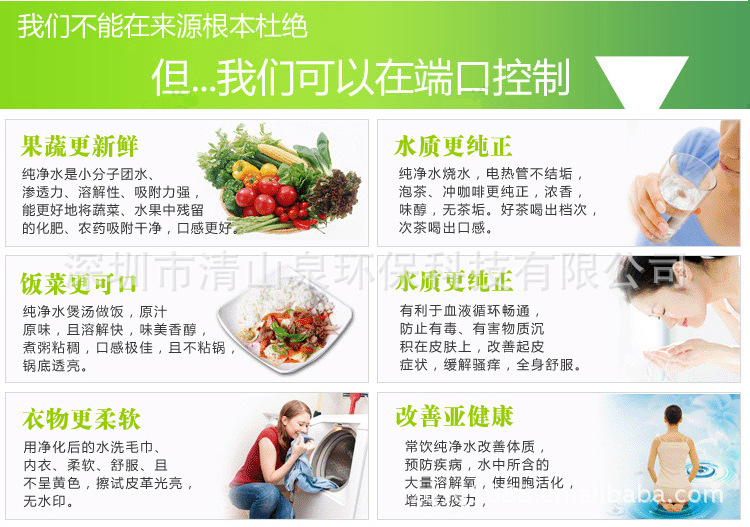 深圳市清山环保科技有限公司成立于2005年,以人类和自然的和谐共存为目标。现已成长为生产净水器、管线机、空气净化器等高品质环保家电产品的世界性环保企业。清山泉,以优秀产品为基础,在中国最先采用产品租赁和服务管理系统取得了高速成长。自成立以来始终保持同行业的前茅。经过努力2009年销售额达到了八千万人民币。清山泉将向中国消费者展示符合中国消费者对健康生活要求的顶尖的高品质产品。干净的水和空气,以200%年增长率清山泉将成为规模为500亿元的中国市场的有力参与者以加大新产品开发。提高产品竞争力为基础,实现中国最好的环境家电企业的目标。而且通过顾客亲自体验可决定购买和租赁的直营店。以上门服务的销售系统和大规模的营销活动在中国掀起环境家电流通业的新潮流。是以研发、生产、销售、工程安装为一体的水处理专业企业。现时拥有2500平方厂房,多年来 公司凭借集团优势,引进欧美各国先进技术与设备,拥有一批长期从事水处理技术开发、研究、应用,时间经验丰富的最优秀的高、中级工程技术人员,为客户提供从设计规划、设备选购、施工安装到售后质量跟踪的高品质、高可靠性的全面解决方案与服务。完美的设计、卓越的品质、精良的施工质量、完善的售后服务致力打造“清山泉”的高质品牌,把握市场发展需要的最新动态,重点于节约能源、环保等领域的开拓。公司的产品已覆盖到生活用水、饮用水、工业软化水、纯水、超纯水、污水处理、新能源热水器及其他新型环保产品的开发等领域。