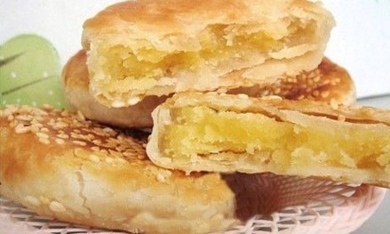 成品呈金黄色,无壳、无粒、无杂质,松软可口,饼皮有多重薄皮叠成,色、香、味俱佳。食时起酥、绵软、润滑,甜而不腻,凉爽适口。