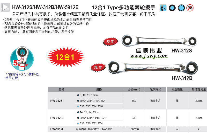 | 型号. | 规格 | 全长(mm) | | HW-312S | 8,10,11,13mm | 160 | | 5/16", 3/8", 7/16", 1/2" | | E10,E12,E14,E16 | | HW-312B | 14,16,17,19mm | 230 | | 9/16",5/8",11/16",3/4" | | E18,E20,E22,E24 | | HW-5912E | 内容物:HW-312S,HW-312B | 160/230 |