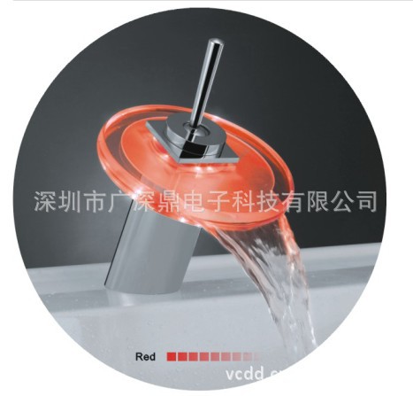 这款LED玻璃瀑布龙头,由铜主体及一块特制的玻璃组成,设计独特、时尚、简洁大气。当开关被打开,水流出来时,镶嵌在玻璃里边的LED灯就会自动亮起来,此时,您不仅能看到漂亮的瀑布水流,还能感受到水中的灯光给您带来的美妙感受,关掉开关,LED灯自动熄灭。此种款式的水龙头不仅给您提供了普通水龙头具备的功能,而且还给您带来瀑布水流的艺术的美,当水温变化时,LED灯的颜色还会随着水温的变化而变化,
