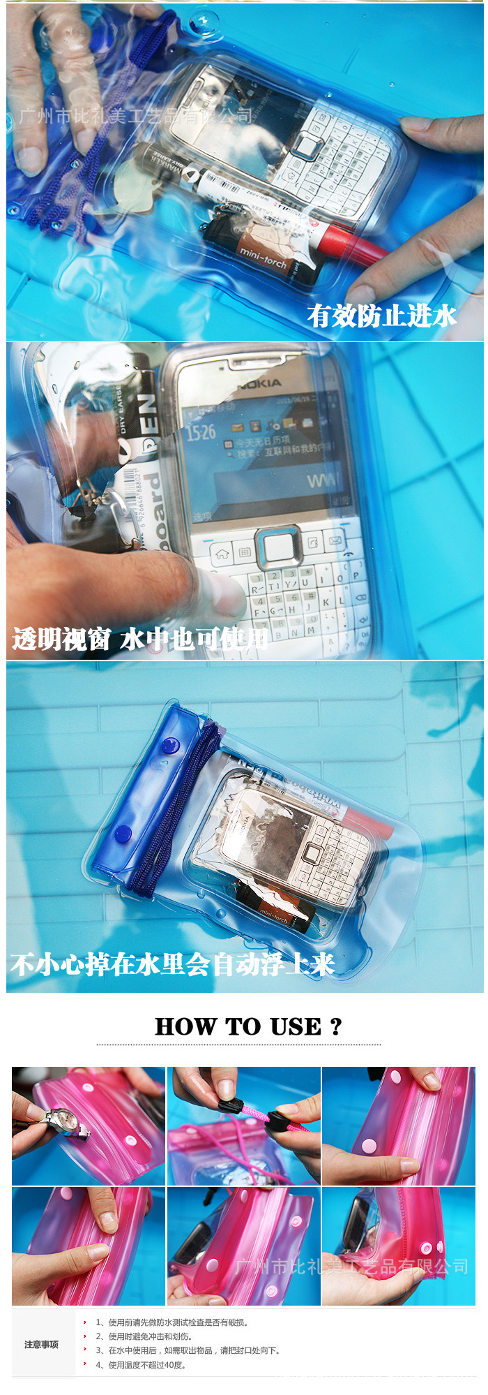 去桑拿、漂流、游泳,再也不用担心没有手机在身边而烦恼了。也不用担心手机,相机会被雨水淋湿而苦恼了。把您的手机装到袋子里面,就像你身边有个保护神一样,无所顾忌,再也不会因为手机进水了而心疼、觉得浪费了。一切烦恼也都没有了。