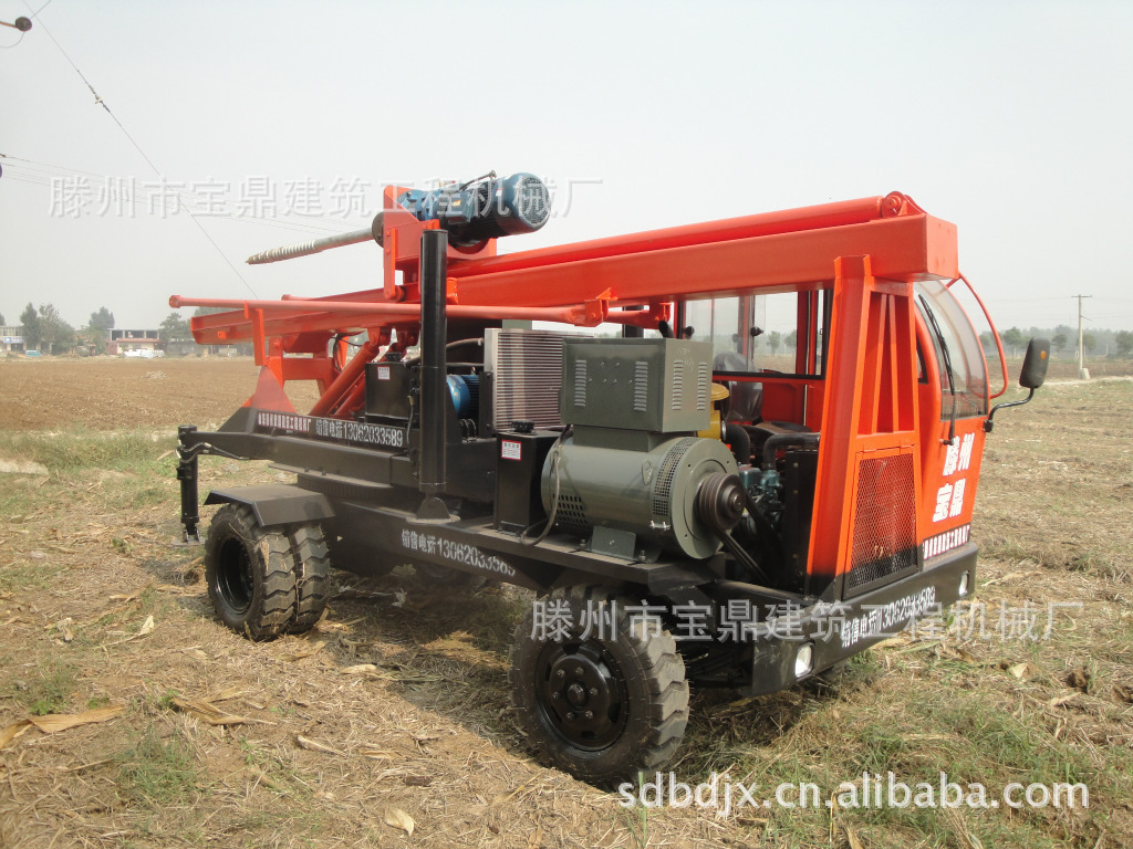 结构特点;打桩机打桩直径15-110厘米(任意选配),打桩深度2-15米,配单缸L32/四缸4102型/四缸4105型柴油机,动力钻头功率15-30千瓦,卷扬机提重1-3吨,发电机30-50千瓦,液压方向,高低速变速箱,加重型底盘。