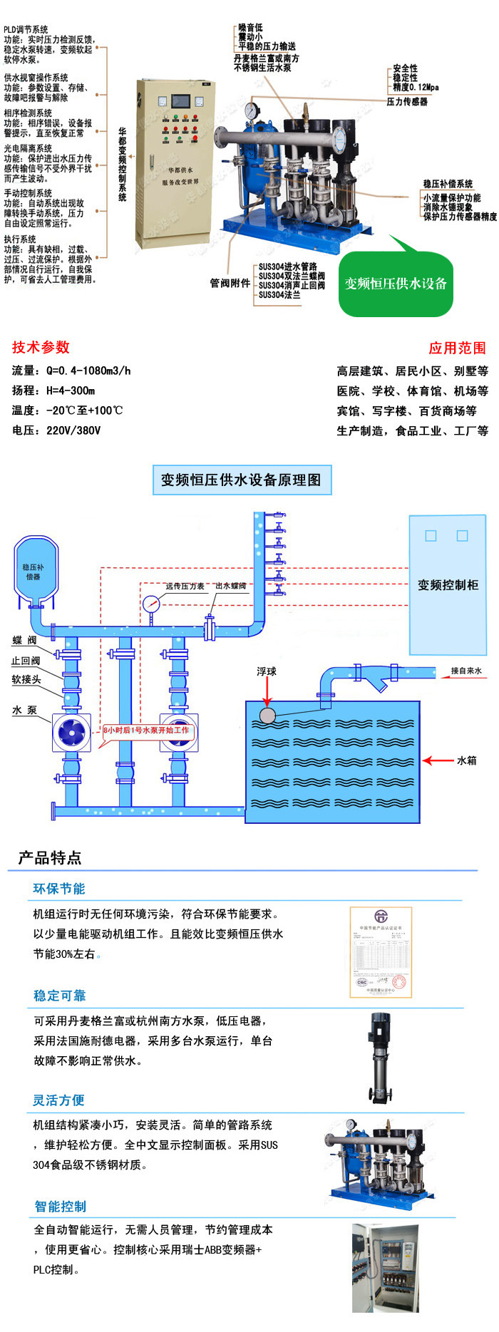 1、环保节能:机组运行时无任何环境污染,符合环保节能的时代要求,以少量电能驱动机组工作,且比一般的变频供水设备节能30%左右。