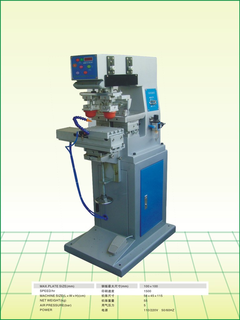1.机器型号:MINI/2S 2.机器名称:双色移印机 3.钢板尺寸:100x100MM 4.印刷速度:2500个/小时 5.电 源:220V 50-60MHZ 6.气 压:5-7BAR | 这是一款小型的落地移印机。此款机型这几年来创下了移印机的销量冠军。目前国内最多厂家亲睐的一款移印机。全铸铝式机身,立式结构,安装程序简易,操作方便。印刷速度最快可达3400次/小时,加宽油盘可获得最大印刷面积20*150MM。适合在电子产品,塑胶外壳,五金制品,文具,小工艺品,礼品的表面图案logo印刷 |