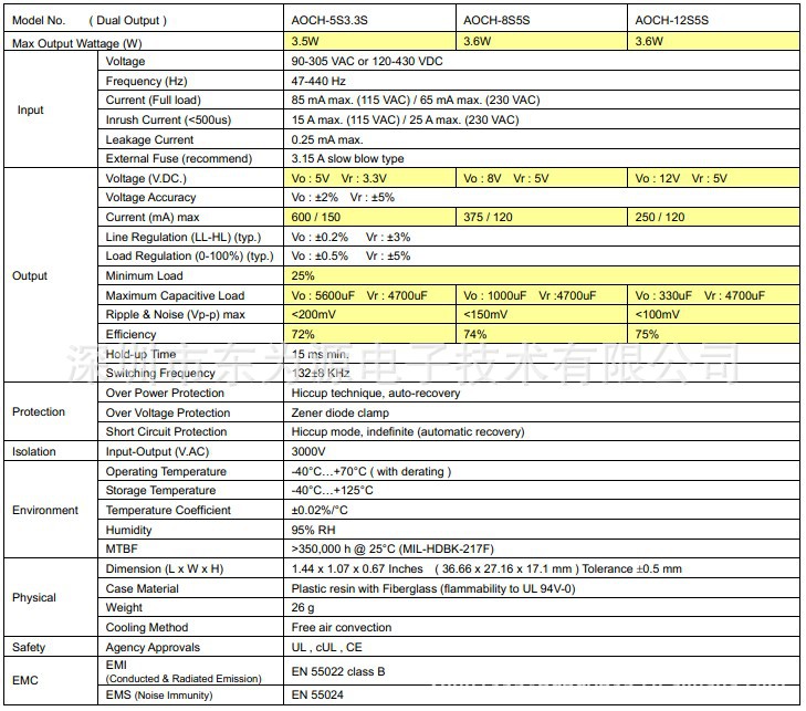 Switching Power Module for PCB Mountable Fully Encapsulated Plastic Case Universal Input Range 90-305VAC, 47-440 Hz Single and Dual Output Low Ripple and Noise Isolation Class II Maximum No-Load Watts < 0.3W CE , UL Approval 2-Years Product Warranty