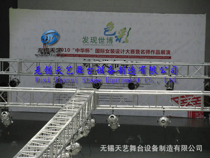 无锡天艺舞台设备制造有限公司是一家以专业生产展览钢制桁架,快装活动舞台,铝合金桁架,铝合金灯光架,雷亚架,A字架,铝合金舞台,玻璃舞台,折叠舞台,展览篷房,T台等系列产品为一体的综合性的大型生产企业。公司拥有成熟的销售团队,竭诚为您提供最优质的服务,拥有最强大的技术和设备支持,全力为您打造质量最精的产品,公司秉承“质量为首,服务为先,诚信为本”的经营理念,立志在行业内创出辉煌!争创行业第一!欢迎来厂参观洽谈。我们竭诚为您提供最优良的品质和最好的服务。 感谢您对我们公司产品的关注和咨询,下面是我们公司常规产品的相关资料,请您详阅,真诚希望有机会合作! 谢谢!QQ:737621735