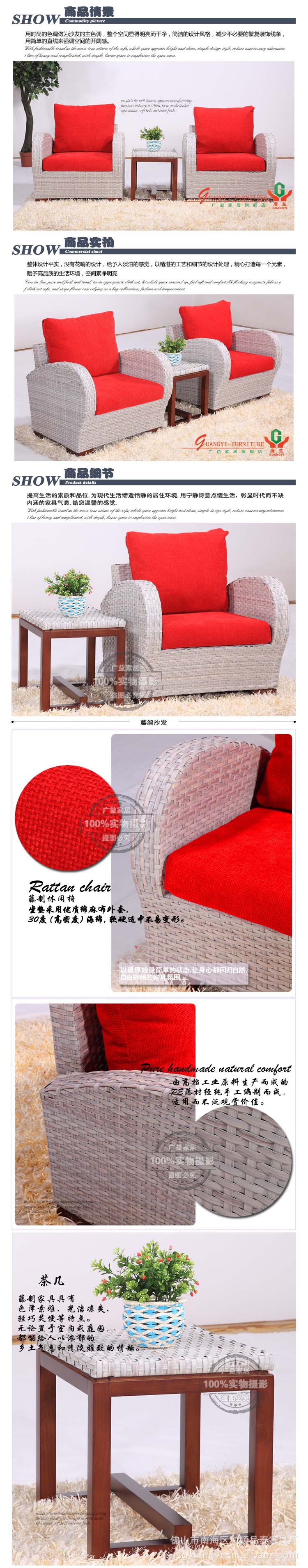 3、仿藤采用优质支架、进口粉体烤漆。高档坚韧PE/PVC藤,较之天然藤条,更具备表面光滑,韧性好易于清洗等优点。流线性设计。款式新颖,充分考虑人体工学的舒适性,而且不怕晒,不怕水洗结实、 不变形、不怕列、价格 也很便宜。不仅休闲大方,而且还为你带来几度异国风情调。 他是您休闲舒适的理想之选,它让您漂亮的房子多一道靓丽的风景线。仿藤家具不怕晒,不怕水洗,结实,比藤桌椅更适合干燥的气候,不变形,不干裂,而且价格便宜。