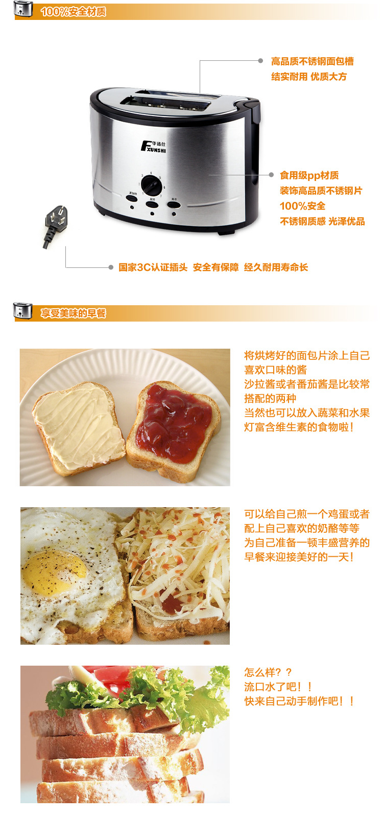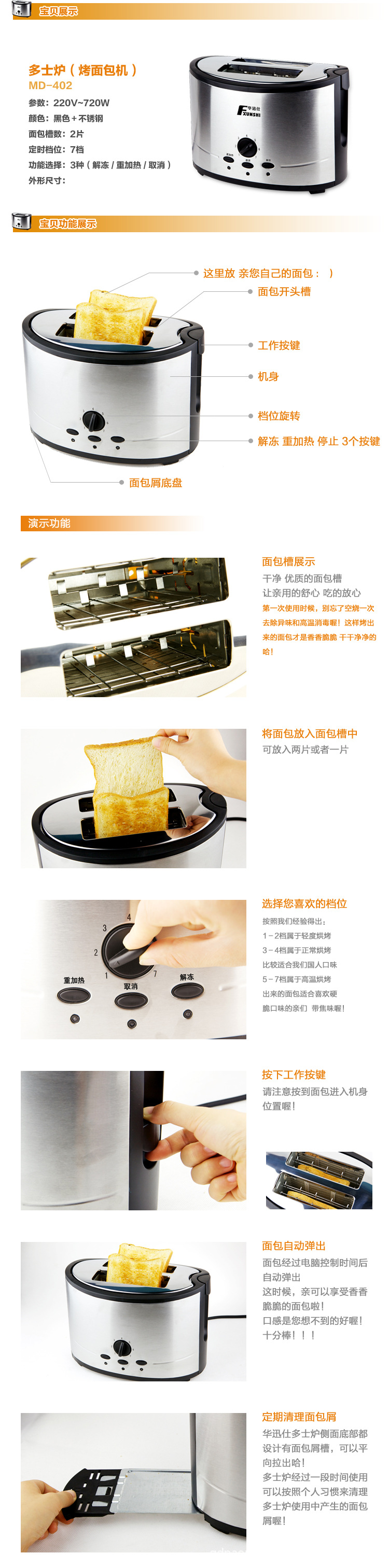 多士炉的功能只有一样,那就是烘烤面包,由于它的设计巧妙,突显了多士炉烘烤的专业化。有人说电烤炉功能多样,除了可以烘烤面包,还可以烤各种肉类、海鲜和简单小食,价格只相差100多元。这是没得比较的,一个专门烘烤面包的家电,出来的面包就是不一样,是全方位的,烤出来的口味也正宗、可口些,例如有调节烘烤焦度,有解冻再烘烤,还有翻热,而且多士炉还有许多长处,它体积小巧,使用方便、安全,功率比电烤炉也小些,省电些。多士炉烤出的面包脆脆的,可以调制不同口感。家里煮早餐,往往是烤面包,再配上一杯牛奶。普通的方包烤出来后还可以随着自己的口味加花生酱、牛奶或芝士。随着社会发展,小家电逐渐进入市民的生活,可以看出市民的生活方式在逐步改变,和以前有所不同,人们更会轻松享受生活。