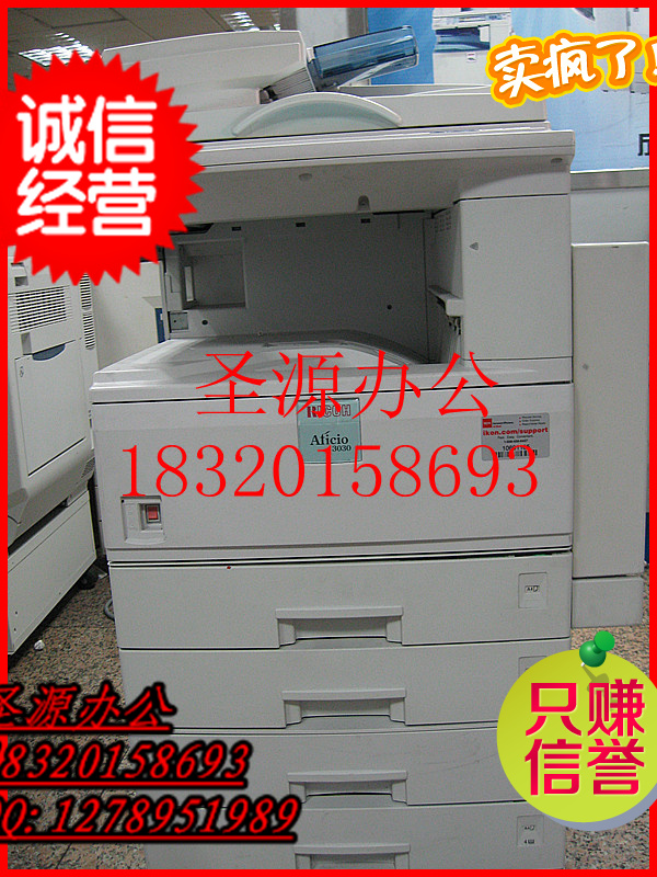 理光3030新款数码复印机,每分钟30张,功能:A3复印,网络打印,自动双面,自动进稿,电子分页等功能,成色在8.5—9成新,本产品可以享受7天包退换服务,此服务只限于机器有质量问题的情况下,退换货的来回费用及包装费由买家支付,24小时服务热线:18320158693