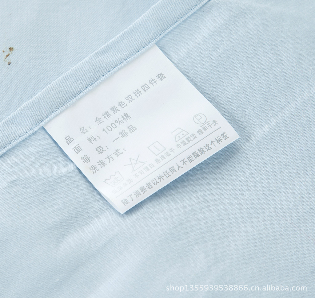 | 全棉素色双拼四件套 | 1.5M-1.8M | 被套:200*230 暗线,锁边、有被角带 | 2.65KG | |