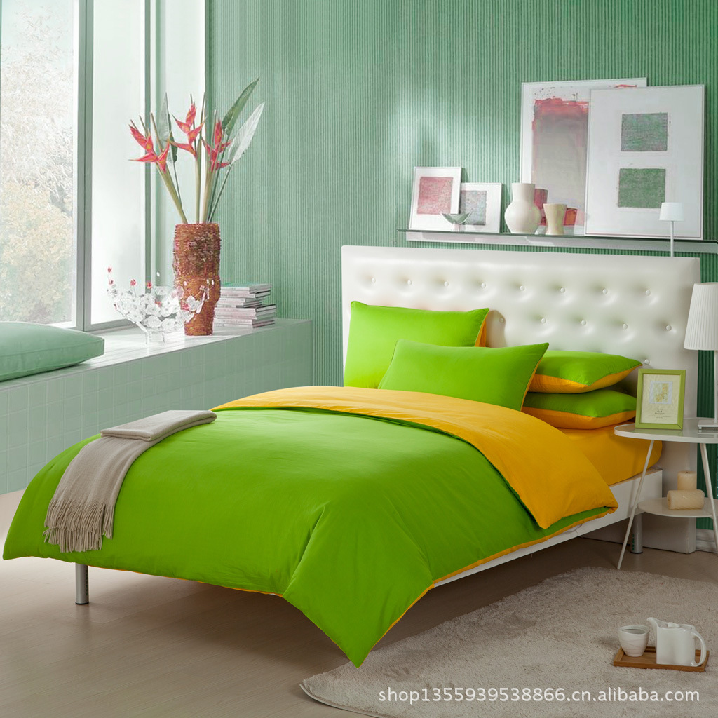 南通货源 杏黄绿 全棉素色双拼四件套件批发 跑量必备