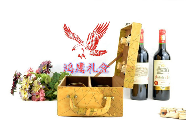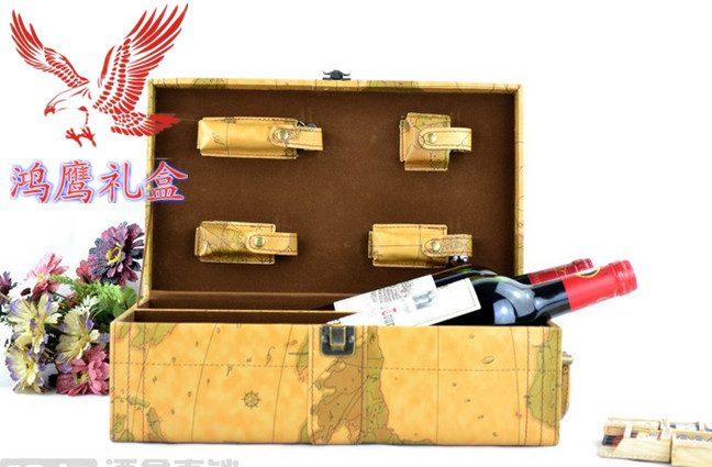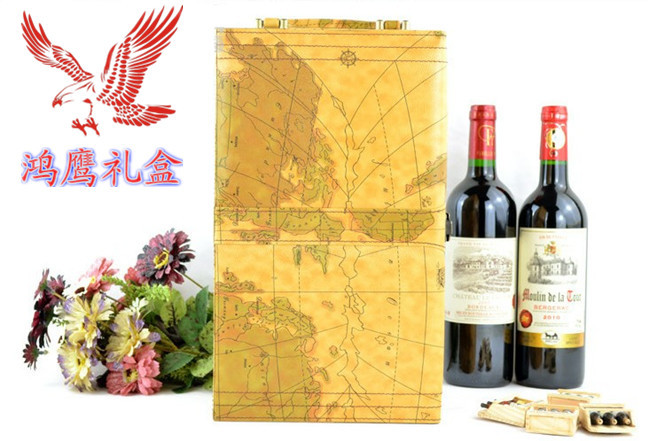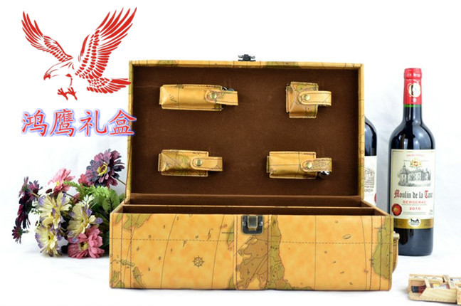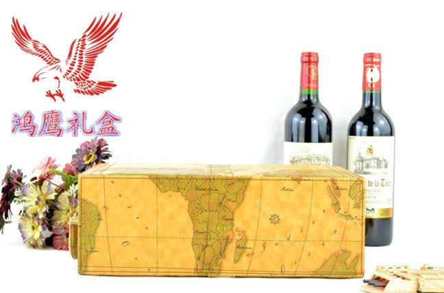 供应双支装红酒包装皮酒盒 地图图案黄色款红酒礼品盒