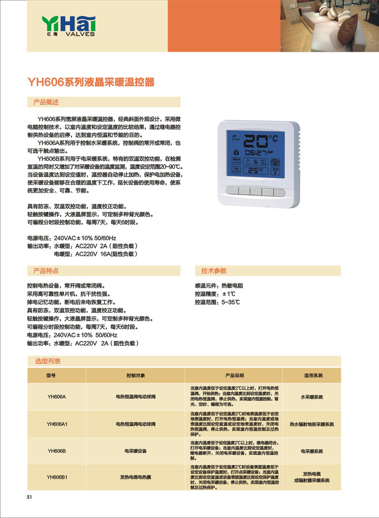YH606系列宽屏液晶采暖温控器,经典斜面外观设计,采用微电脑控制技术,以室内温度和设定温度的比较结果,通过继电器控制设备的启停,达到室内恒温和节能的目的。