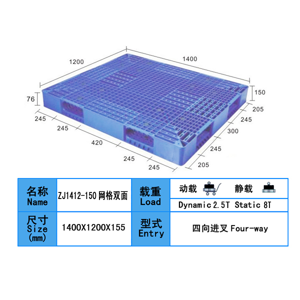 塑料托盘以低压高密度聚乙烯为主要原料制成,是与国际物流接轨一次注塑成型的托盘(卡板),它正在逐渐替代我国叉车使用的木托盘或钢托盘。是储运业的新产品,搬运仓储的好助手,与钢托盘、木托盘相比具有质轻、平整、美观、使用寿命长、整体性好、无钉无刺、无味无毒、耐酸、耐碱、耐腐蚀、易冲洗消毒、不腐烂、不助燃、无静电火花、防滑溜(装有防滑垫)、可回收等优点,使用寿命是木托盘的5-7倍。是现代化运输、包装、仓储的重要工具,是国际上规定的用于食品、水产品、医药、造纸业、电子电器、纺织、烟草、化学品、立体仓库等各行业之储存必备器材。