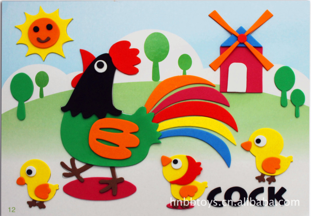 EVA的材料背面都有背胶,揭开一层背胶纸即可粘贴。参照图案逐层粘贴好。
