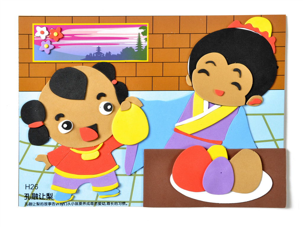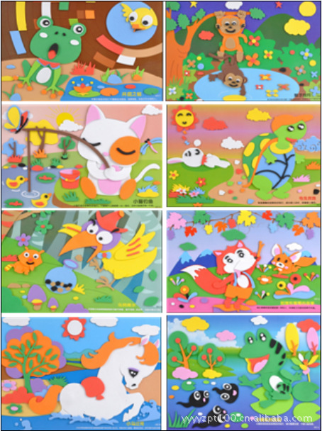 EVA的材料背面都有背胶,揭开一层背胶纸即可粘贴。参照图案逐层粘贴好。