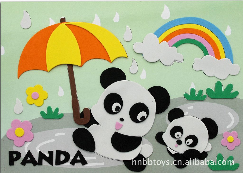 EVA的材料背面都有背胶,揭开一层背胶纸即可粘贴。参照图案逐层粘贴好。