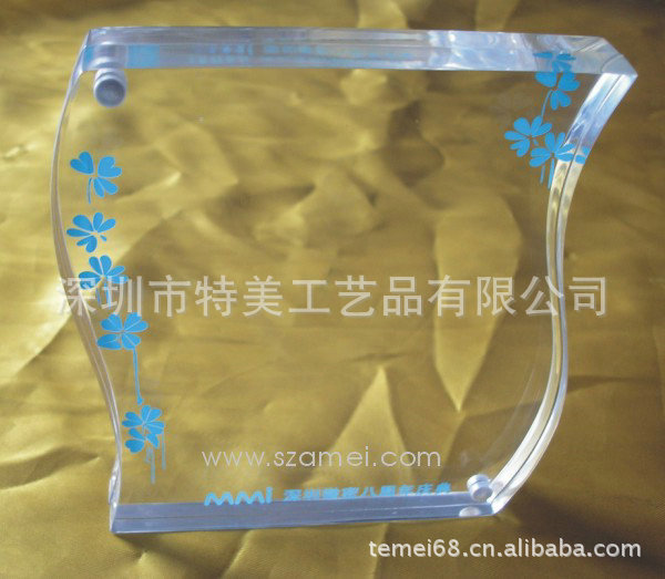 有机玻璃(亚克力)具有水晶一般的透明度、玻璃一般的透光率,但密度只有玻璃的一半,因此它不像水晶、玻璃那么易碎;有机玻璃(亚克力)的耐磨性能与铝材接近,并且具有良好的适印性和喷涂性,采用适当的印刷(如丝印)和喷涂工艺可以赋予有机玻璃(亚克力)制品理想的表面装饰效果;此外,有机玻璃(亚克力)有良好的加工性能,既可采用热弯成型,也可用机械加工方式钻、车、切割等;另外,还可用激光切割和激光雕刻,制作效果奇特的制品。