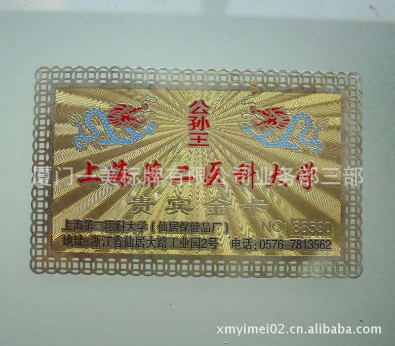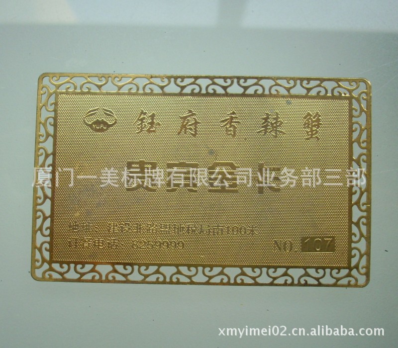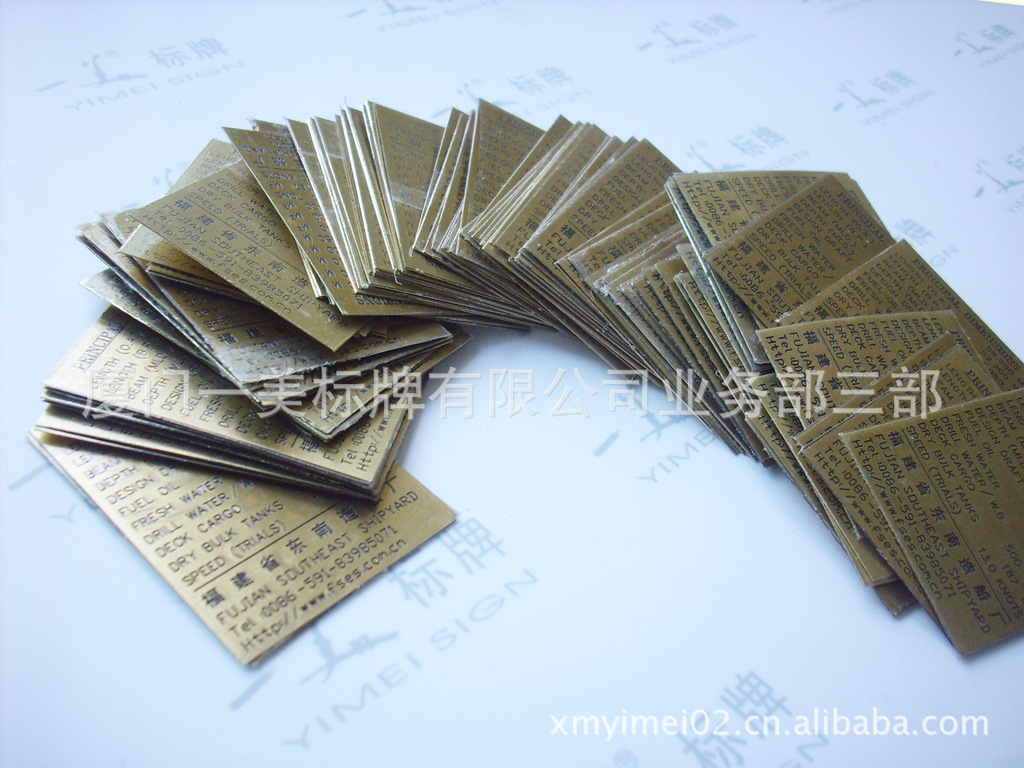 厦门一美标牌有限公司是专业生产各类标识标牌,标志标签,铭牌铭板的厦门标牌厂家。本厂地处现代化滨海新城区——厦门同安。经过9年发展,现已成为福建闽南地区一家专业的具备一般纳税人资格的综合性生产企业。本公司生产的铭牌产品涵盖生活的方方面面。材质有铜,铝,铁,不锈钢,锌铝合金,塑胶,PVC,ABS,PMMA,不干胶等多种选择。工艺有化学腐蚀,丝网印刷,电脑雕刻,冲压,压铸,烤漆,滴胶,滴塑,电镀,氧化。我们有9年的行业经验,专业的技术班底,公司热忱欢迎新老客户来电来函洽谈业务,本公司将竭诚与您携手合作,共创美好未来。