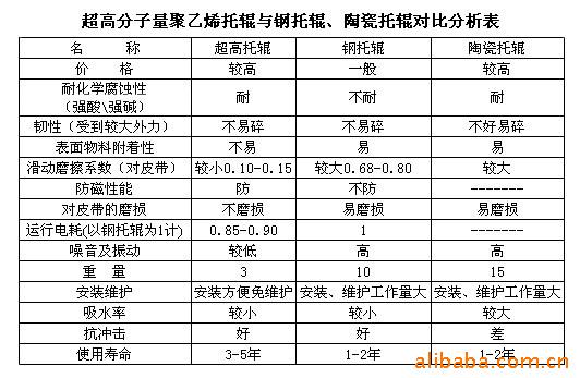 超高分子量聚乙烯托辊是由超高分子量聚乙烯管材、金属轴承,金属轴,塑料轴承座,密封圈等组装而成的一种产品。超高分子量聚乙烯托辊与金属托辊相比,在使用性能上具有了诸多明显的优势。超高聚乙烯UHMW-PE塑料托辊具有很好的自润滑性和不粘结性。因此在托辊表面不会粘附与堆积物料,托辊表面不易结垢,摩擦系数低,减少托辊与胶带之间摩擦,万一不转动时,也不会产生“咬伤”皮带的事,超高托辊运转灵活平稳,驱动电耗低,有显著的经济效益;同时有效减少输送过程中皮带的跳动、跑偏、溢料,掉料和皮带磨损;重量轻,超高托辊重量一般仅为同规格钢托辊重量的1/3,转动惯量小,噪音低,运行平稳,安装更换很方便,减轻了劳动强度和维护量,运行成本低;合理的密封设计,良好的密封效果。托辊采用带密封盖的轴承,辊筒与轴承座、钢轴之间用密封胶、迷宫槽等密封技术,防水、防尘效果显著;还可以按照客户要求增加壁厚和改变支撑结构来提高托辊输送的承载性能及定制非标准型号托辊。