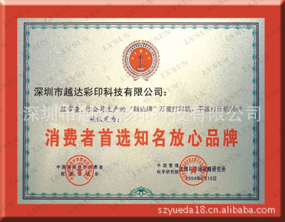 深圳市越达彩印科技有限公司坐落于深圳市龙岗区,是全国家生产万能平板打印机的专业厂家。经过十余年发展现已成为占地5000平方米,专业技术人员40余人,员工200余人专业生产万能平板打印机的权威公司,深圳市东方龙科万能平板打印机有A4A3A2A1A0A++等几十款机型,(也可分为经济型万能平板打印机、加长型万能平板打印机、高速型万能平板打印机等型号),以及服装专用机·玻璃移门专用机·高精度UV平板宽幅数码喷绘机·UV平台喷绘机·平板玻璃喷绘机·UV平板喷绘机·亚克力PVC平板喷绘机.(日本爱普生.武藤.精工)专用进口机型。 深圳越达在董事长的领导下,以“科技领先,印刷无限”的理念,形成了一个成熟完整的生产管理体系。今天,东方龙科将秉持“以诚相待、以信为本、以优取胜”的经营理念,“以科技求发展、以质量求生存”的质量方针。“真诚互沟通、服务无止境”的服务精神,把最好的万能平板打印机、高效的万能平板打印机、可持续发展的印刷设备和方案提供给广大客户。龙科,一个正在崛起的企业,一个不断开拓的企业,怀着“持续发展,中国”的深远志向,以非凡的魄力缔造辉煌与梦想,引领着印刷机械行业新时代的腾飞! 供应定做YD7880c工艺玻璃喷绘机是一台高科技印刷设备,可以在任何软、硬质材料表面直接印刷任何图案,免中间耗材,它应用非接触式的印刷技术,任何多色图案一次打印成功,无需制版,工序简单、即喷即干,具有快速、高效、灵活的个性化输出特点,是手工绘画、各类转印、丝网印刷技术的一次技术创新。打印的图案色彩艳丽,具有防水、防晒、耐磨损、永不褪色等特点。突破了数码印刷技术瓶颈,是传统印刷机的替代产品,它不受任何材料限制,可以在木板、玻璃、水晶、PVC、ABS、亚克力、金属、塑料、石材、皮革、布,宣纸及其它纺织品等表面进行彩色照片级印刷。不论是简单的块色图案,全彩色图案或是具有过度色的图案,都能一次印刷完成,无需制版、无需晒版和重复套色,应用领域非常广泛。 供应定做YD7880c工艺玻璃喷绘机适用打印产品: 地砖地板瓷砖天花板瓷器陶瓷大理石马赛克油画金属标牌有机玻璃移门玻璃,艺术玻璃,工艺玻璃,玻璃彩图,钢化玻璃印画,水晶玻璃,U盘、MP3/MP4、移动硬盘、手机、硅胶笔记本电脑外壳、光盘、礼品、玩具、文具、家私水晶工艺品、玻璃彩印、金属名片盒、PVC钥匙扣、亚克力板、ABS塑材、皮革制品、竹木工艺等。 供应定做YD7880c工艺玻璃喷绘机优势: 1、无与伦比的机头升降技术。现在就全国来讲,只有我厂有机头升降的机器,这也是我公司为什么增加成本改机头升降的原因。 2、小型机器与同行相比在一些小细节上有很巧妙的改变,像同行的传动是钢丝传动,如果钢丝有断的现象,就只能整机返回原厂修复,而我厂采取的是皮带传动,如果皮带有坏的现象,只需寄一根皮带就能解决问题,所以在售后方面会更加方便,其次同行的是抽屉导轨,我司采用的是圆形导轨,性能与稳定性和精度都有所加强。 3.公司开发机型有20余种,各种规格,各种型号,总有一款适合您的,满足您的专业需求。 4.我公司以“真诚互沟通、服务无止境”的服务精神,把最好的万能平板打印机、高效的万能平板打印机、可持续发展的印刷设备和方案提供给广大客户。