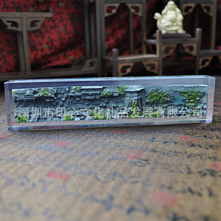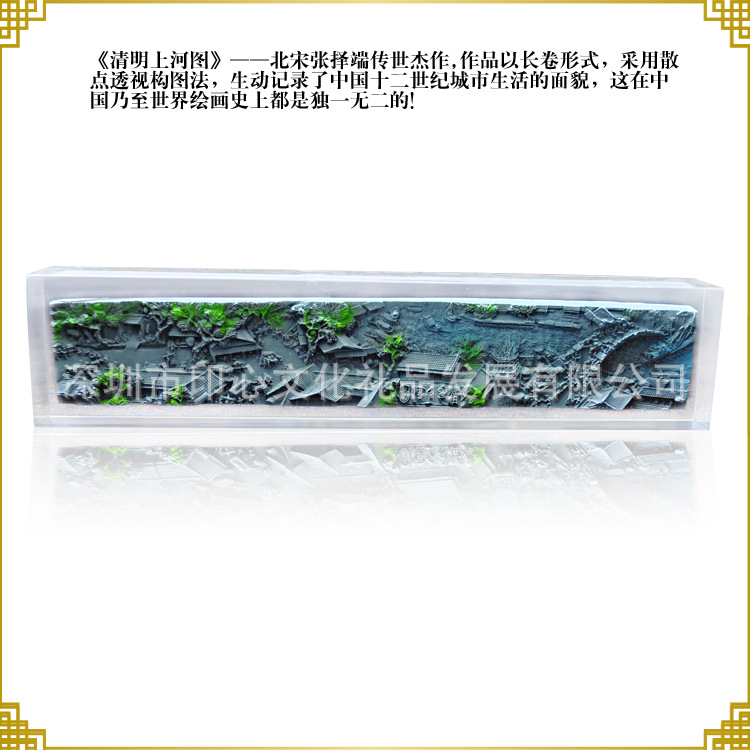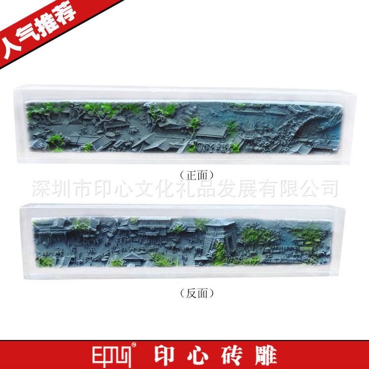 •微縮浮雕傳承了東周時期的磚雕藝術及古代劳动人民智慧的结晶,注重體現产品的歷史和文化內涵,選取的主題氣勢磅礴,工藝流程複雜考究;是根據廣角透視學、立體空間學、美學等特點,融入現代水晶技術微縮雕刻而成的立體景觀。具有濃郁的民族風格和我國傳統建築的藝術特色。通過微縮浮雕的展現,畫面生動、意義鮮明,是觀賞、收藏、饋贈、紀念、商務禮贈的最佳選擇。