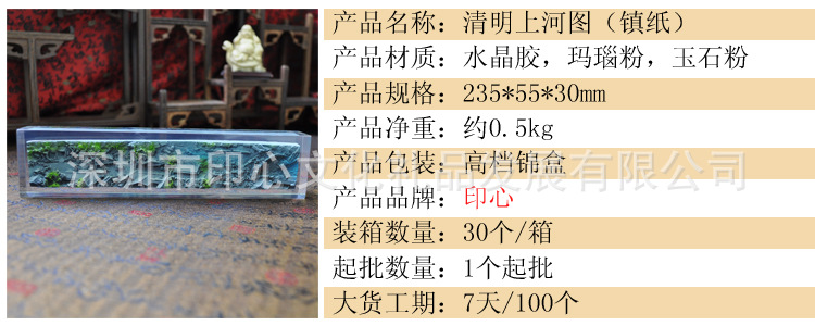 •本产品浮雕部分为石头粉末与水晶胶混合物,经过加工成型后,由雕刻师用纯手工雕刻出浮雕图案,再经过加温使之完全固化,固化后再经过修胚打磨处理,再着入古代砖雕色泽,最后再融入现代水晶技术,用水晶胶体包裹,使之完全融入水晶胶体之中后,再经过抛光打磨。