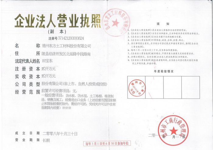 德州东方土工材料股份有 限公司 联系人:徐桂新 先生 电 话: 86 0534 8291711 移动电话: 13793469977 传 真: 86 0534 8291711 Q Q: 965005684 地 址: 中国 山东 陵县陵县经济开发区北辰路中段路