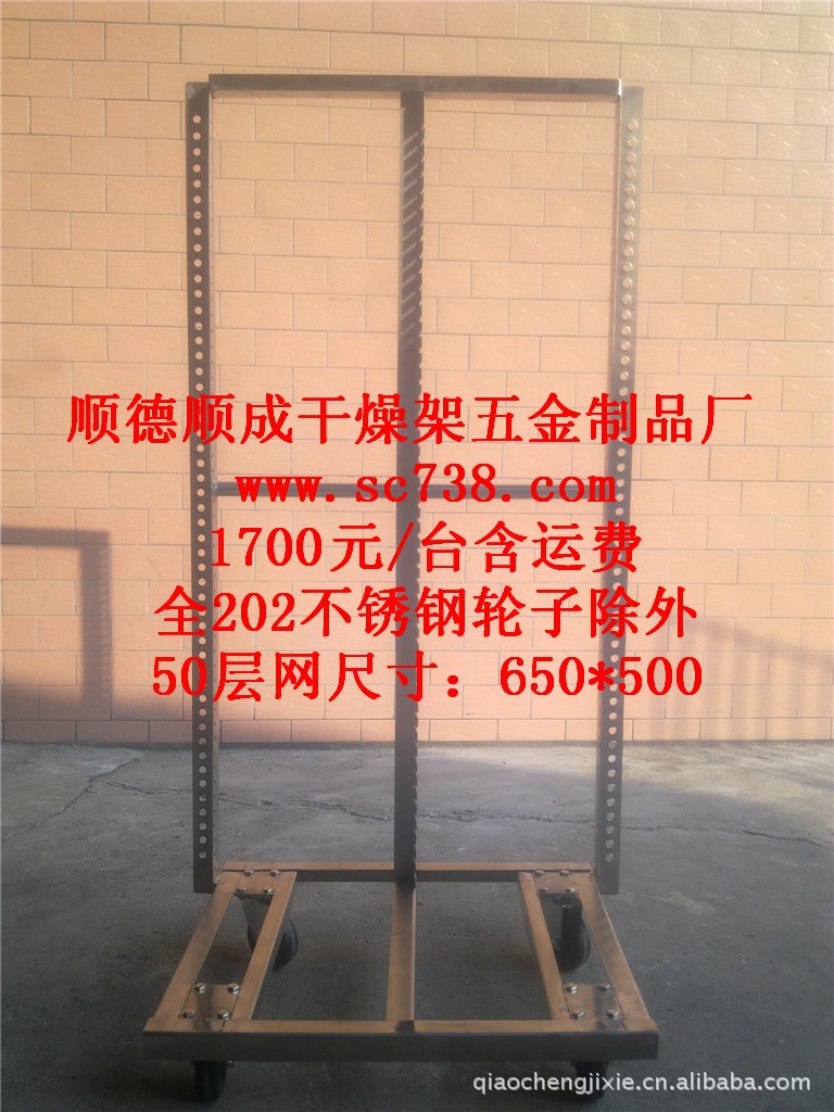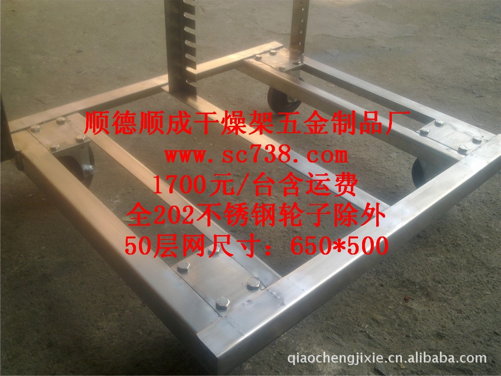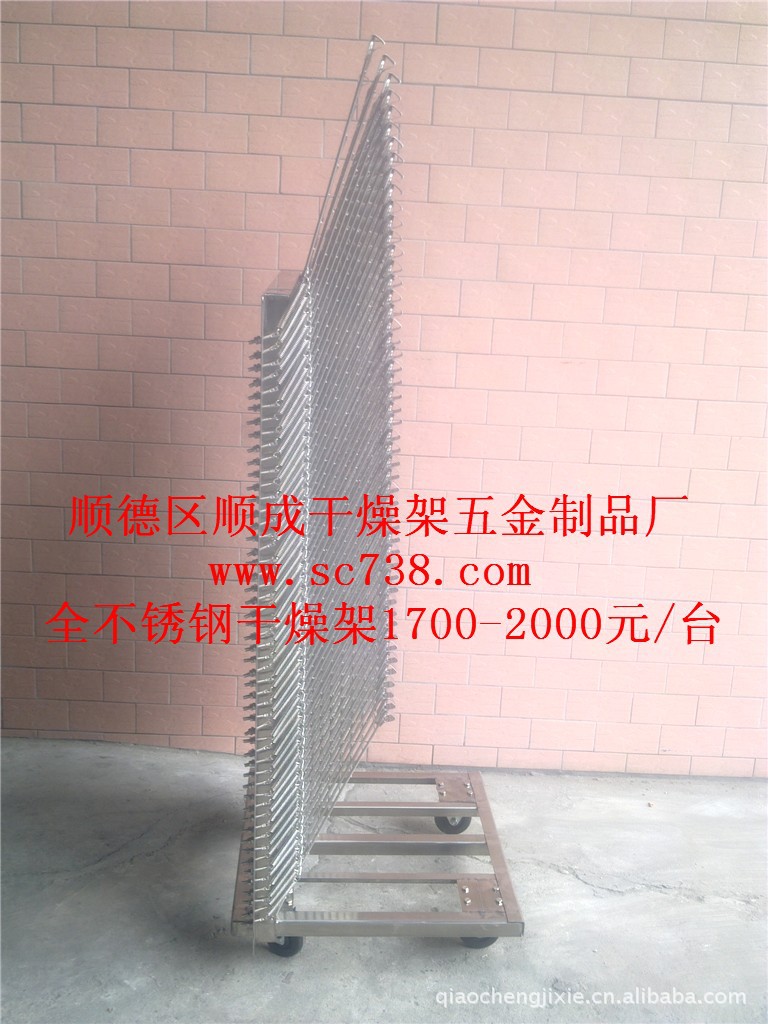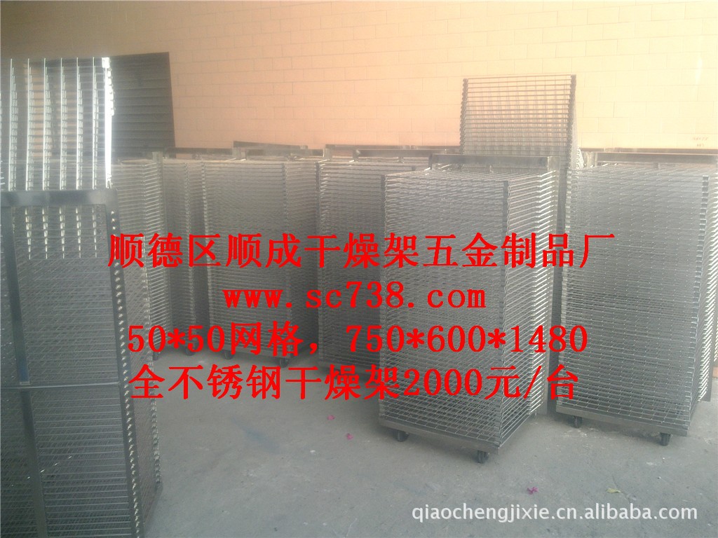 网格50*50,网尺寸:650*500,外尺寸:750*600*1480,网片材料:201不锈钢线外5内2.5中粗5,底架除脚轮全202不锈钢,弹簧和螺丝全为201不锈钢,现货供应1700-2000元/台,干燥架千层架生产厂家,产品性能稳定,用途广泛如: 您好,我厂专业生产干燥架、千层架、晾晒架,印刷、上胶、喷漆、上色后的晾干置放器材。活动式多层网格设计,置放空间大,操作方便,节省车间、库房面积,本产品承载量大,特殊规格可依据客户需要设计制造,置放空间大,易于操作,规格、尺寸多变化,可根据客户特殊要求设计制造。并可适用于所放产品的常温晾干和进焗炉高温烘烤,广泛适用于丝印厂、转印烫画厂、印刷电路板厂、电子加工厂、饰品厂、鞋厂、皮带皮革厂、防静电器材厂、木器涂装厂、彩绘玻璃、上糊干燥、中大型家具厂等。