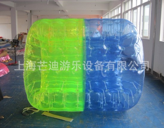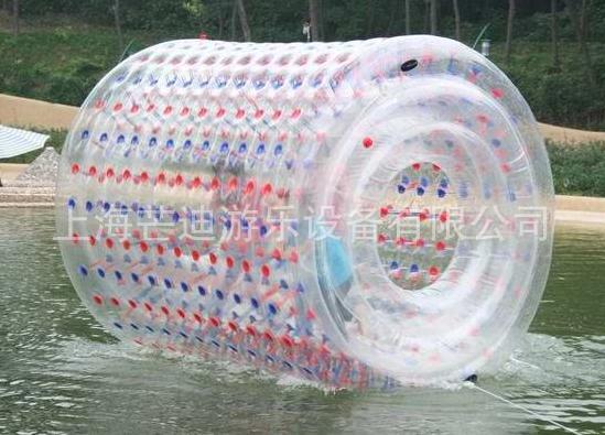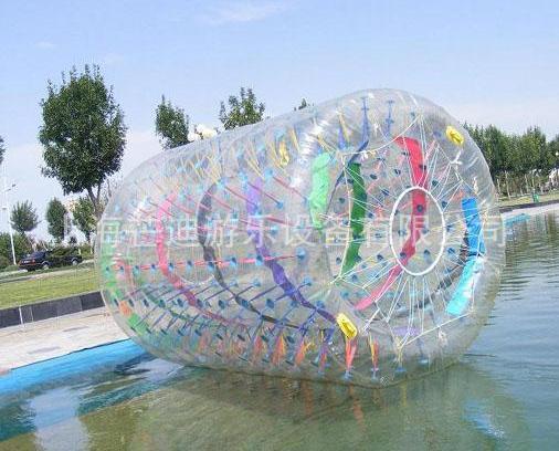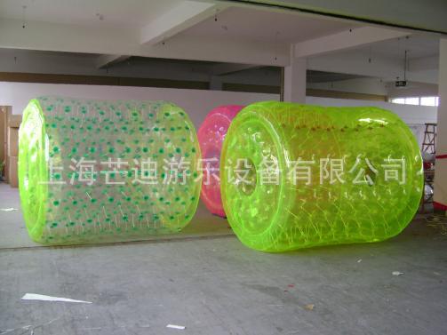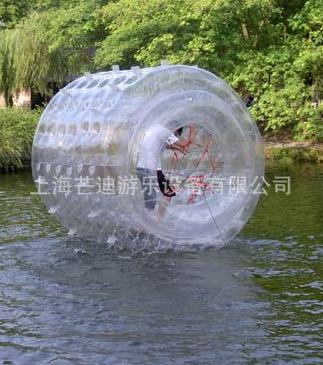 水上滚筒球(又名:水上风火轮)它是继水上步行球之后又一水上火爆产品。 它所用材料采用高透明度、高弹性的进口聚氯乙烯材料,厚度为0.8mm, 滚筒长度2.5米,内径1.9米,外径2.3米, 重量68KG,可载重量180KG,不易侧翻非常安全。多个充气气囊充一次性充气后,游客从两端进入便可水上行走、水中漫步。它集新颖、趣味、安全、刺激、健身于一体(时尚、休闲、娱乐、健身、蕴含商机)。