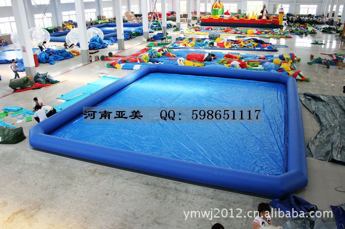 材料:充气水池主要材料是加网PVC布料,厚度一般为0.9mm,大小可随时订制,一般池的形状为长方形的,当然也会出现其他不规则的形状,比如圆形,菱形。所用材料无毒、无色、无味,达到欧美标准的绝对环保材料,由质量监督局检测结果显示此材料对皮肤无刺激性,无毒性对儿童完全没有伤害。此材料为一种专业的充气布,耐寒性好,可达零下40度低温;阻燃性好。充气水池