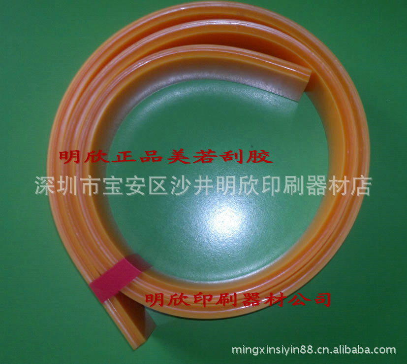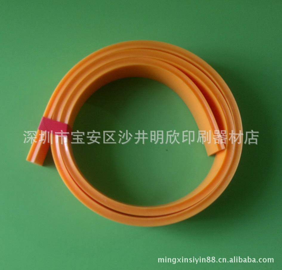 该刮刀为日本美诺刮刀 主要用于线路板高精密丝印印刷 适用于太阳能电池、液晶屏、手机屏印刷 规格:50*9*85A-80A*1500 黄色,刮刀背面有一个圆弧槽