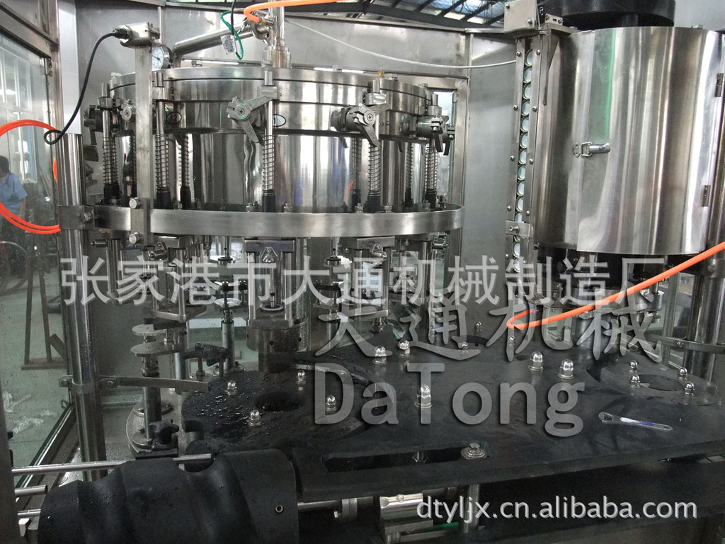 灌装机是我公司引进德国技术,运用等压灌装原理自行设计制造,实现将液体灌装到由冲瓶机送过来的洗好的瓶子中。