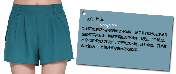 一款带有亚光色泽的清爽短裤,尽显优雅、活泼。夏季穿上这款短裤超显年轻与活力哦!搭配休闲鞋穿着轻松自如,搭配高跟鞋穿着立即显得时尚优雅。