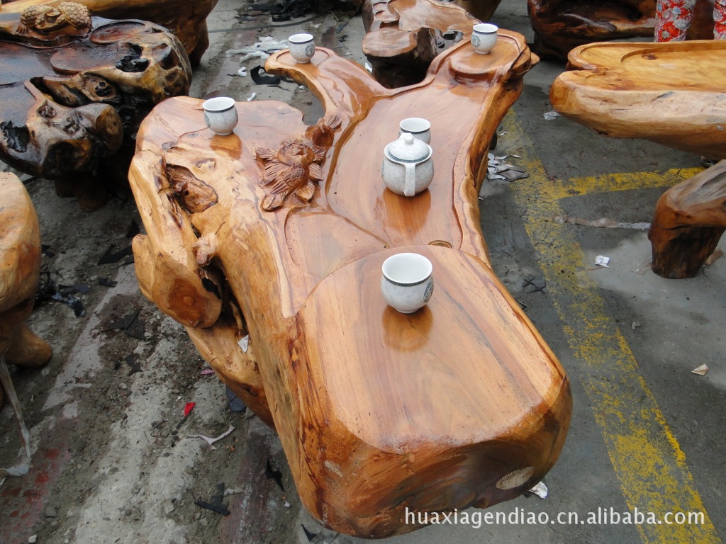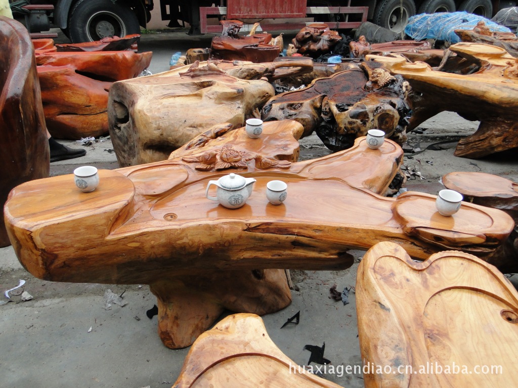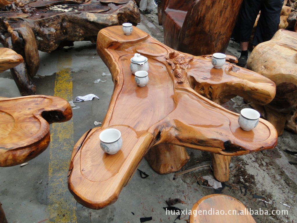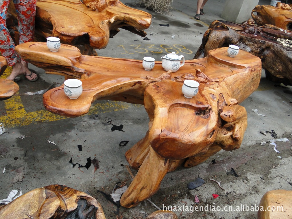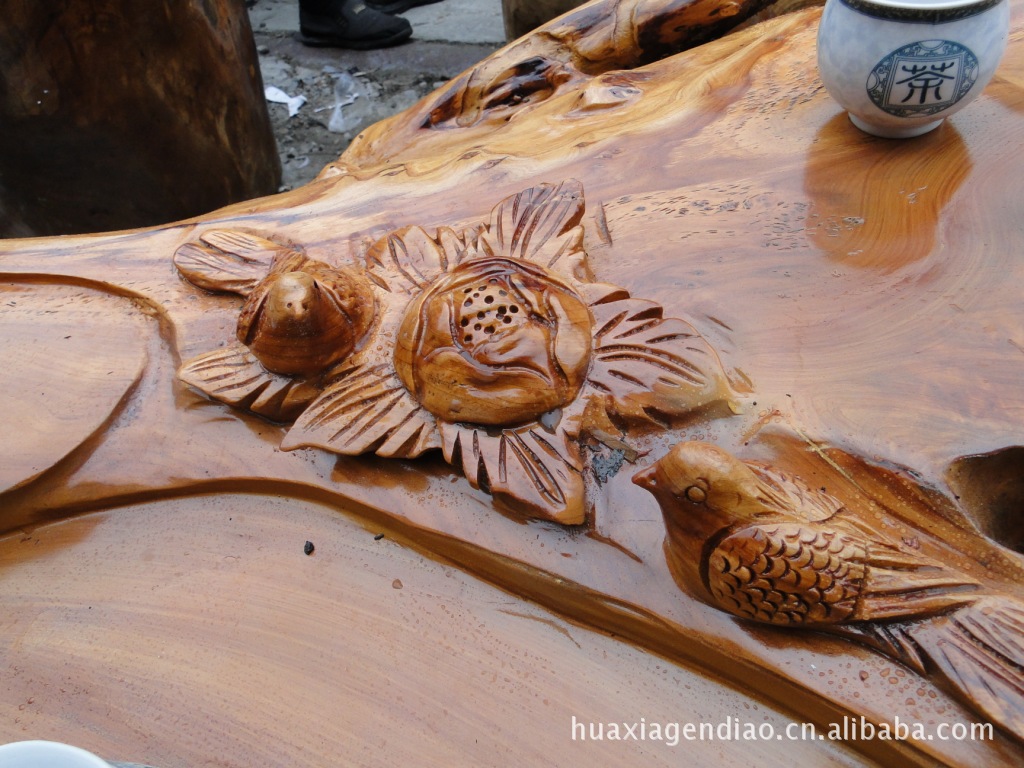 红心樟根雕花开富贵茶桌:由百年樟木制作而成,茶几大型高档,很有现场冲击力,是一个整体的树根制作而成,没有任何的拼接成分,且完全是根据树根的造型随形加工而成,大气天成,造型美观,有非常高的收藏价值!根据树根的自然形状加工而成,独具特色,是非美观!除了有茶具的用途之外,此茶桌自身也有很强的感染力与装饰性,可单独摆放作为装饰。既有实用性,又有装饰性。再配上几根杉木或者枣木凳子,一边喝茶一边聊天,十分惬意!是家居摆设,馈赠亲友的上乘之选。