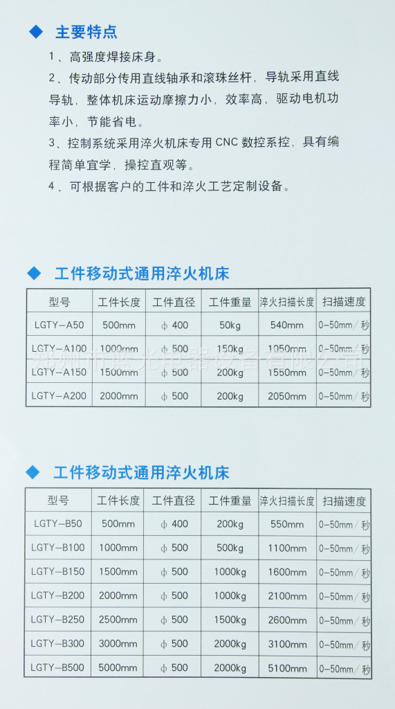 | 型号 | 工件长度 | 工件直径 | 工件重量 | 淬火扫描长度 | 扫描速度 |