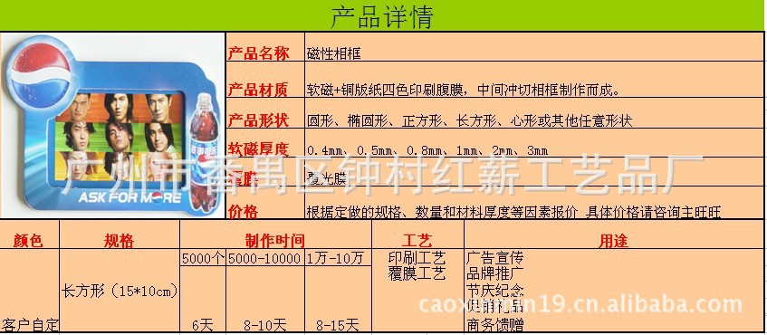 1磁性冰箱贴:采用下面软胶磁铁+上面铜版纸四色印刷腹膜,