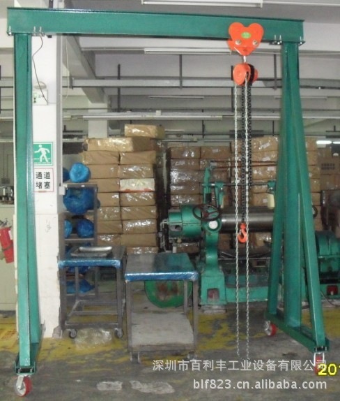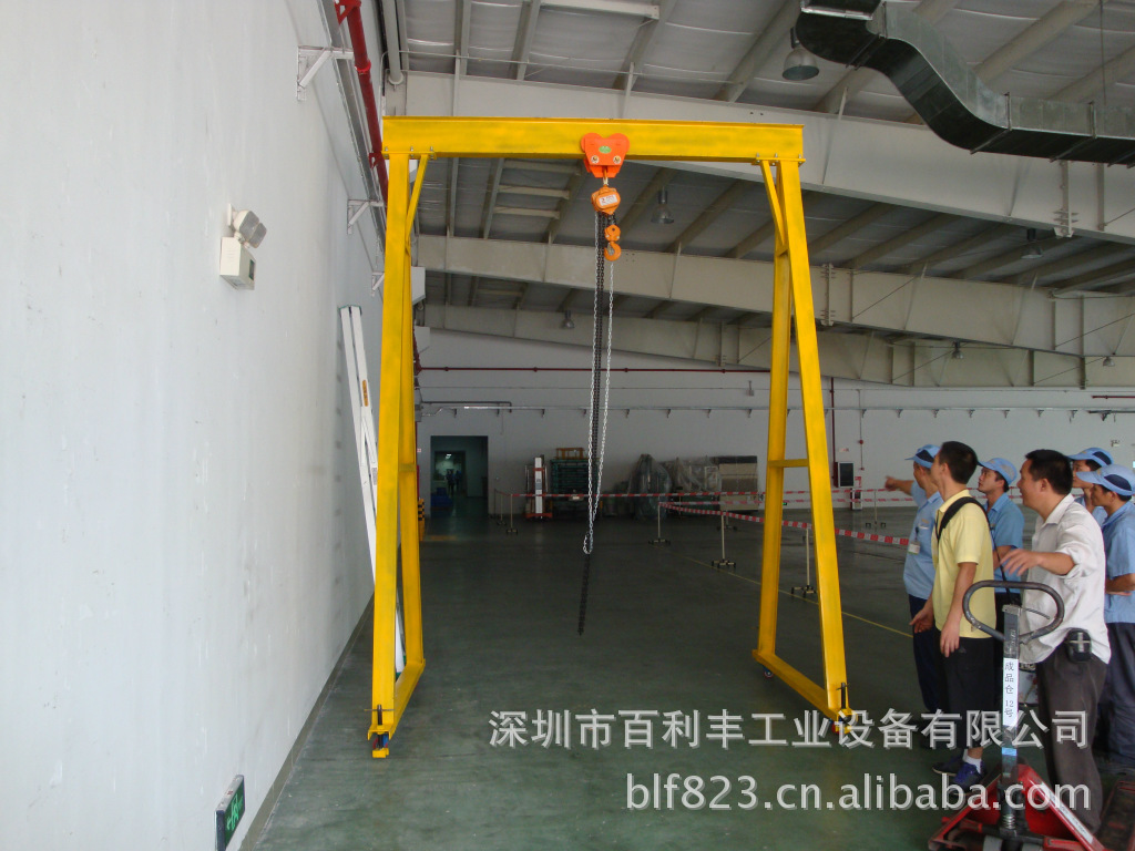龙门架适用范围:适用于制造模具、汽修工厂、矿山、工地及需要起重场合。该移动龙门架最大的优点是可全方位移动性,可快速拆卸安装,占地面积小,用微型汽车就可转移到另一个场地安装使用。详细介绍: 移动起吊小龙门架是深圳百利丰公司根据中、小工厂(公司)日常生产需要搬运设备、仓库进出货,起吊维修重型设备及材料运输的需要,开发出来的新型小型起重龙门架。适用于制造模具、汽修工厂、矿山、工地及需要起重场合。该移动龙门架最大的优点是可全方位移动性,可快速拆卸安装,占地面积小,用微型汽车就可转移到另一个场地安装使用。宽度、高度可分级调节,钢架构设计合理,能承受从100~5000KG重量。尤其适用于车间设备的安装、搬运、调试。 汽车上货物的装卸,汽修车间吊装发动机大件等。起重小龙门架主要有二种规格:一是在地面上全方位移动的龙门架,带刹车承重轮可在地面上移动,适合在地面上起吊物品;二是用钢轨固定安装在楼板面或梁上,通过电动或人力葫芦,实现起重机械化。可减少人力,降低生产运营成本,提高工作效率。我司可根据客户的现场情况定做不同的产品。移动小龙门架吊运葫芦可选用手拉葫芦或电动葫芦,产品实用性强。畅销珠三角,深受厂家欢迎。
