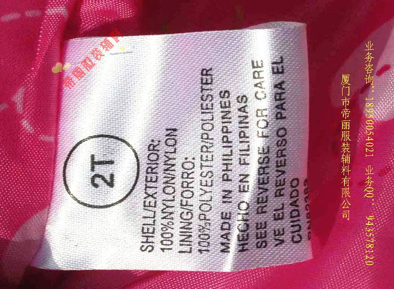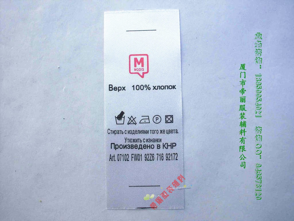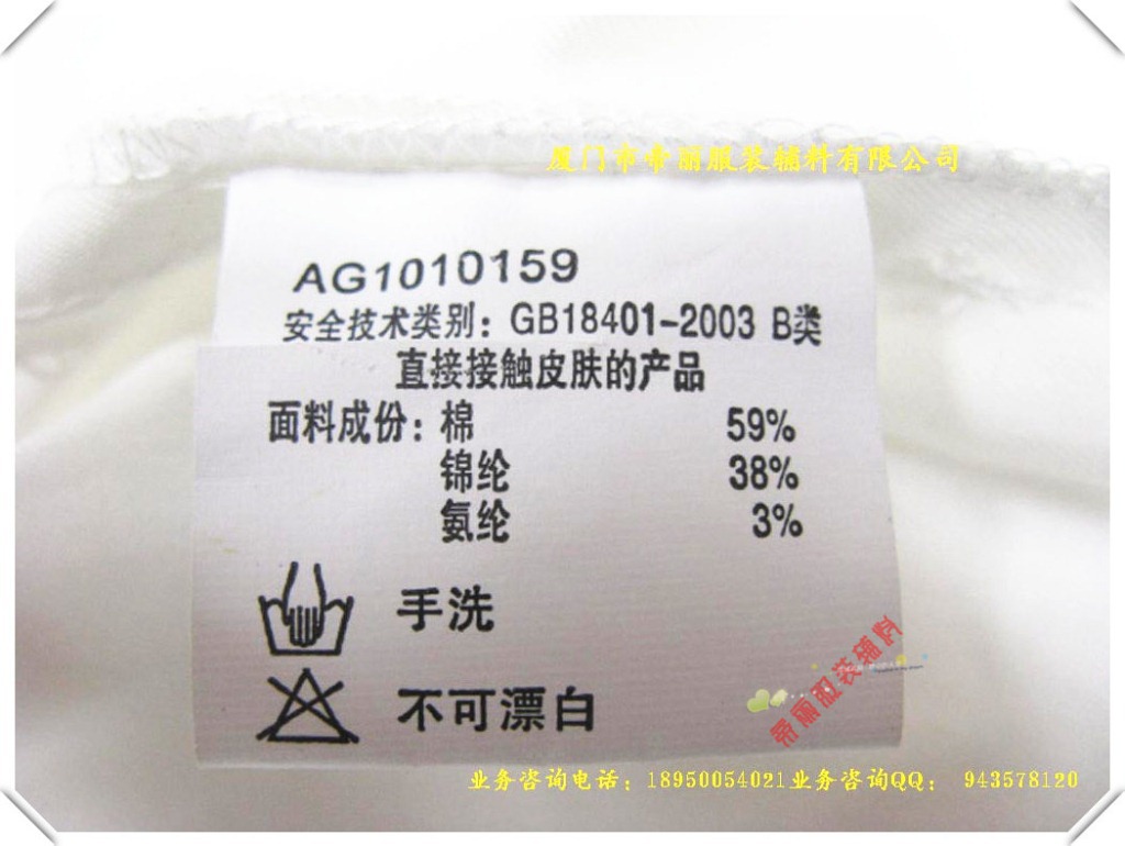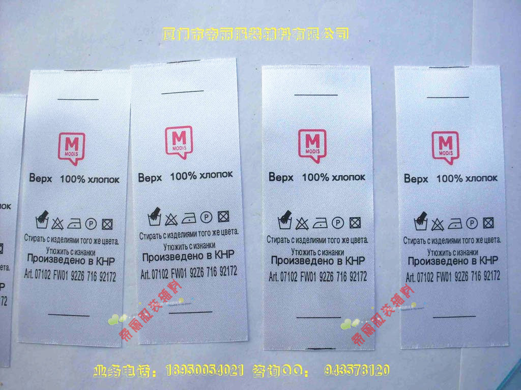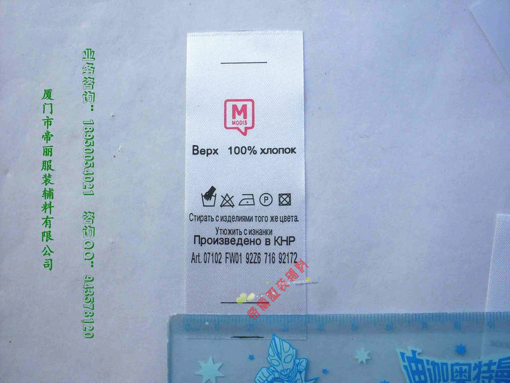 部分:【行业术语讲解】 1.缎标是水洗标的一种,缎标和布标是最常用到的水洗标 2.缎标和布标的区别: 缎标是缎带的绸缎材质,外观有点反光效果 布标是胶带合成布材质,外观有点像打印纸,也有叫胶带 3.布标印刷机台: 轮转印刷,当然不干胶机台也可以印刷。 4.说明: 本公司使用的是专业生产水洗标的轮转机台印刷,印刷效率高,效果更好,成本更低! (另外本公司还有电脑刺绣标,它不同于印刷的,内容是用针线缝出来的) 声明:以上图片绝对是我们自己拍摄的图片,而不是像很多厂家在网上随便找过来忽悠大家的,最后落得客户要求按照图片上的款式和材料来做,厂家却没有实样可参考! 我们可以向客户展示我们自己拍过的缎带成份水洗标的实样(产品仅供参考,需要的请定制自己的内容)!! 从来方便大家通过网上来定做!! ---------------------------------------------------------------------------------------------------------------- 第二部分:【产品描述】 以下报价仅供参考,详细的请跟我们业务员联系! 上面是成份水洗标图片详情: 颜色:单色印刷 (最多可以印刷七种颜色) 规格:3.5*9cm 数量:5万 产品报价:0.05元/片 水洗标我们平时买衣服,毛巾,被单等各种产品上的商标,标签。 ------------------------------------------------------------------------------------------------ 第三部分:【实例:成份水洗标】 成份水洗标高清晰图片欣赏: 张:成份水洗标