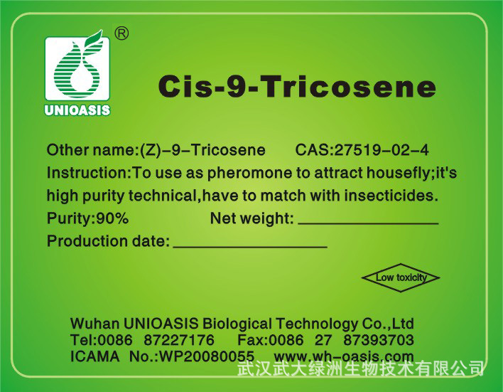 本产品可用作家蝇的性引诱剂,干扰交配;对螟虫也有一定引诱效果。和杀虫剂配合使用将显著提高杀虫剂的杀虫效率,有效减少杀虫剂的使用量。