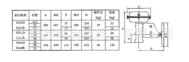 概述HA多弹簧薄膜执行机构是CV3000调节阀的驱动机构,具有体积小、重量轻、操作维修方便的特点。HA多弹簧式薄膜执行机构,是把气动调节仪表的输出压力转变成推杆位移的变化。因此,只要它与调节阀的阀体部分相连接,就可把阀芯移到与输入信号相对应的位置。该执行机构是多弹簧式薄膜执行机构,结构紧凑,输出力大。作用型式正作用:HA1D、HA2D、HA3D、HA4D反作用:HA1R、HA2R、HA3R、HA4R注:1、正作用执行机构:薄膜气室供气压力增加,执行机构推杆向外伸出。2、反作用执行机构:薄膜气室供气压力增加,执行机构推杆向里缩进。零件材料膜 盖:碳钢膜 片:乙丙橡胶夹尼龙推 杆:不锈钢支 架:HT200弹簧范围:0.02~0.10、0.08~0.24MPa供气压力:0.14~0.40 MPa气源接头:Rc1/4环境温度:-30~+70℃附件 定位器、空气过滤减压器、保位阀、行程开关、手轮机构等性能 回 差:带定位器--小于全行程的1%回 差:HA不带定位器--小于全行程的5%回 差:HA2~4不带定位器--小于全行程的3%基本误差:HA1带HEP定位器—小于全行程的±2%基本误差:HA2~4带定位器—小于全行程的±1%基本误差:带定位器—小于全行程的±5%
