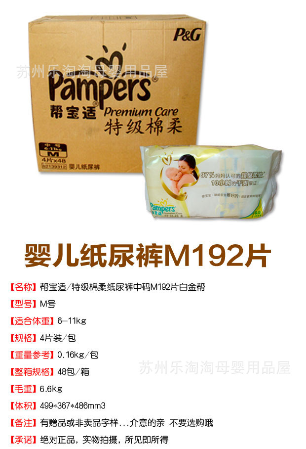 帮宝适特级棉柔白金帮纸尿裤M192片M4片×48包