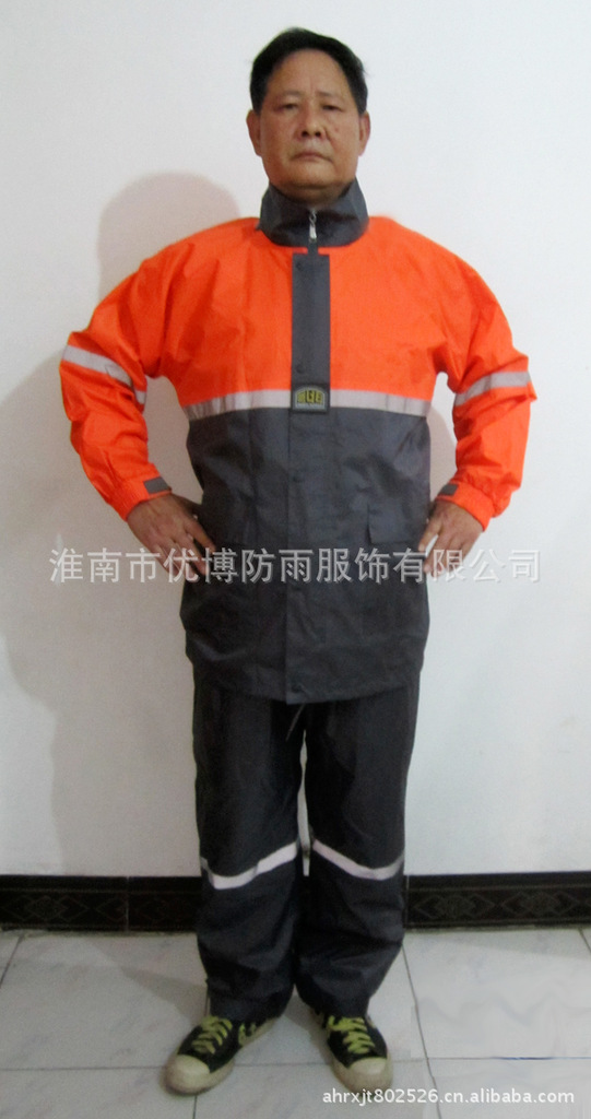 该款式为190T涤丝纺面料,加涂100%防水PVC涂层,里层透气透湿网格设计,高强度反光条,暗藏式帽子和袖口设计,松紧裤腰,袖口裤脚加魔术贴设计,上下身分体套装,防盗防水口袋,休闲款式大方,是理想的安全的野外作业防护雨衣。