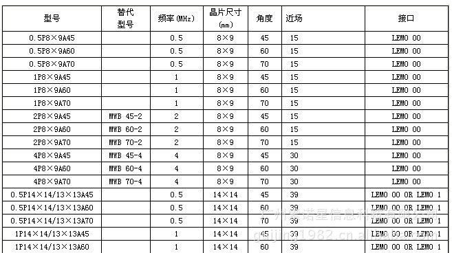 型号:频率:2.5P、4P、5P尺寸:8×9、9×9、10×16、13×13、14×14、18×18、20×22角度:K 1、K 1.5、K2、K2.5、K3、A45、A60、A70等