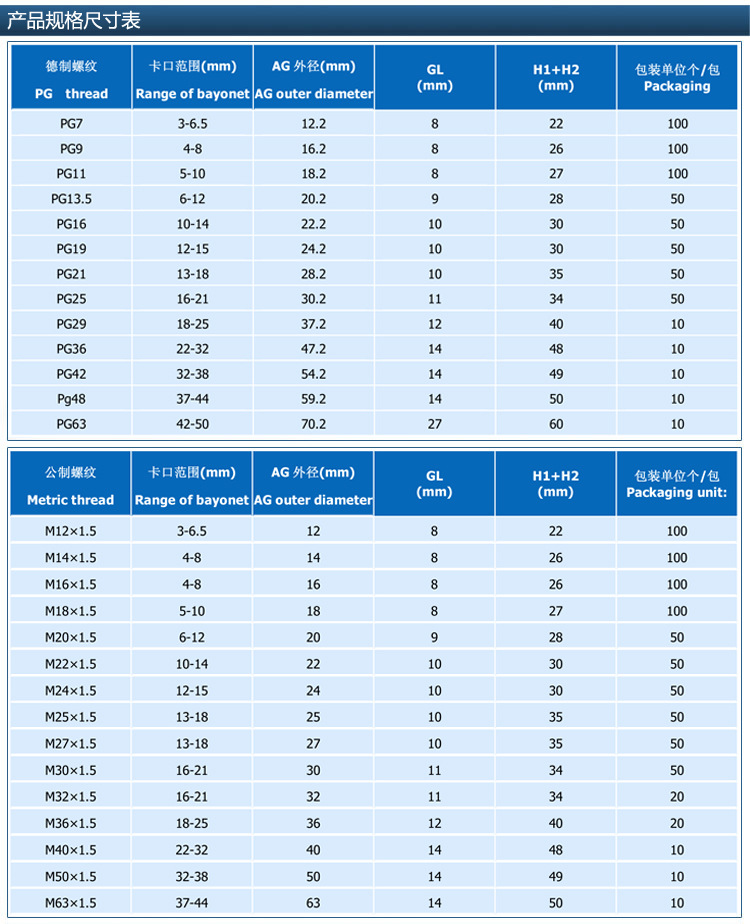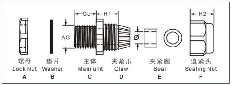 | ◇产品材质:A.C.E部位采用UL认可的尼龙PA66,B.D部位采用丁腈橡胶; ◇螺纹规格:公制(Metric),德制(PG),英制(G),美制(NPT); ◇工作温度:静态-40℃至100℃,瞬时耐热至120℃;动态-20至80℃,瞬时耐热至100℃; ◇产品特性:特殊的夹紧爪与橡胶设计,夹紧电缆范围大,带自锁功能,抗拉力特强;可防水、防尘、防盐、耐酸碱、酒精、油脂及一般溶剂; ◇颜色种类:黑色、白色、灰色、特殊颜色可定做。 ◇Material:Parts A,C,E are made of UL approved nylon PA66,parts B and D are made of nitrile butadiene rubber(NBR); ◇Thread spec:Metric,PG,G,NPT; ◇Working temperature:-40℃ to 100℃ in static state,instantaneous heat resistance up to 120℃; -20℃ to 80℃ in dynamic state, instaneous heat resistance up to 100℃; ◇Characteristice:Special desing of clamping die and rubber part, large range in clamping cable, ultra-strong stretching resistance, waterproof, dustprooand high ability to resist salt,acid,alkali,alcohol,grease and generla solvent; ◇Color:Black,White,Grey as well as special colors that can be designed at request. | |||||||||||||||||||||||||||||||||||||||||||||||||||||||||||||||||||||||||||||||||||||||||||||||||||||||||||||||||||||||||||||||||||||||||||||||||||||||||||||||||||||||||||||||||||||||||||||