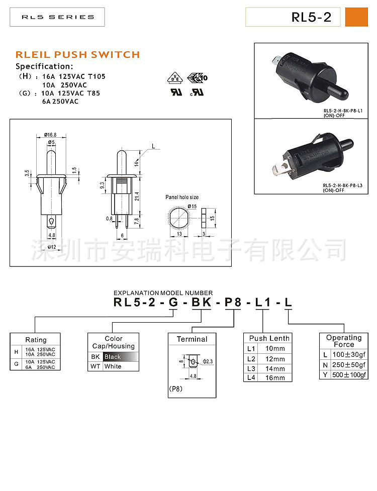 RL5-2直径16.8MM按键开关白色94V0按键开关|深圳市安瑞科电子专业生产各式船型开关|电话:0755-29805463传真:0755-29805221|QQ:376775108|
