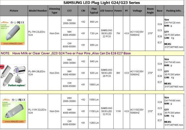 Model | PL-7W-22LED-G24/G23 | PL-9W-28LED-G24/G23 | PL-11W-36LED-G24/G23 |