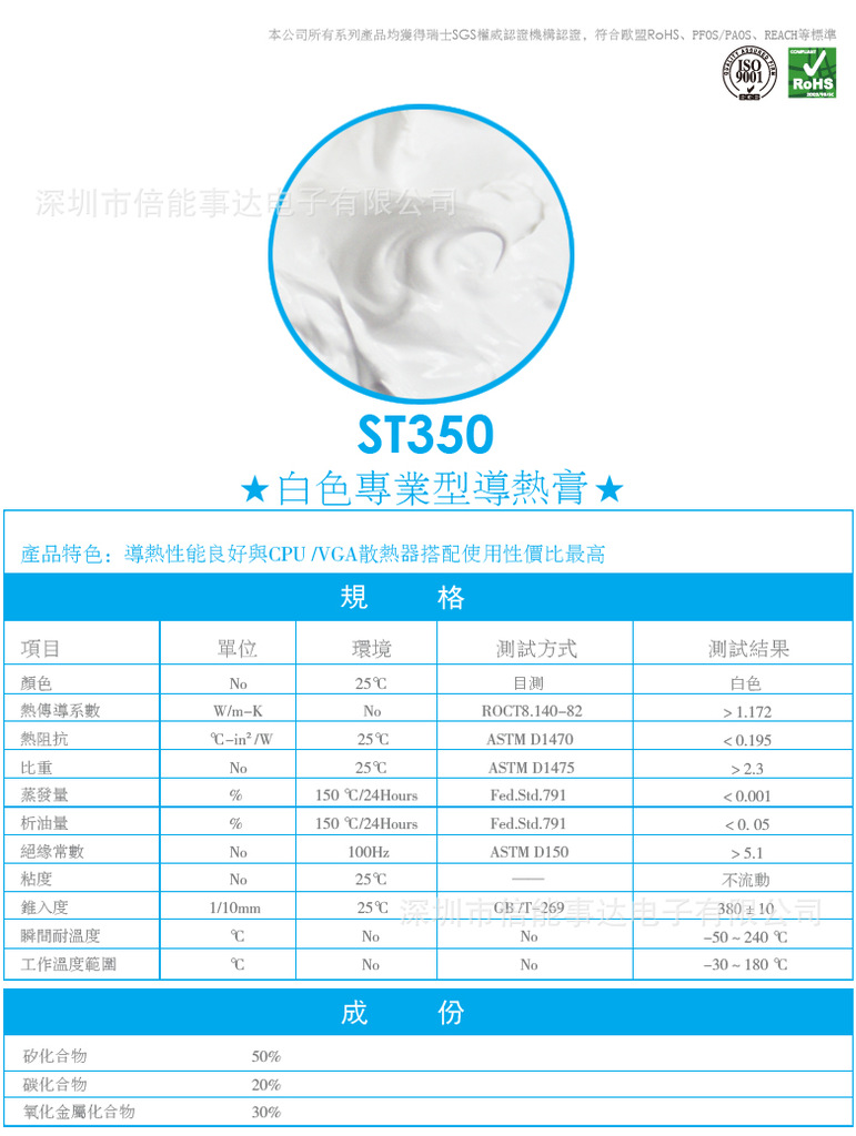 品牌:stars星牌产品型号:ST-350热传导系数:>1.172W/m-K热阻抗:<0.195工作温度范围:-30~180℃