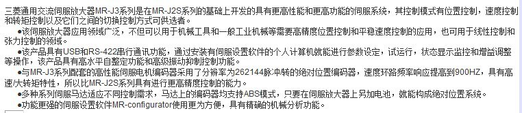 三菱通用交流伺服放大器MR-J3系列是在MR-J2S系列的基础上开发的具有更高性能和更高功能的伺服系统,其控制模式有位置控制,速度控制和转矩控制以及它们之间的切换控制方式可供选者。