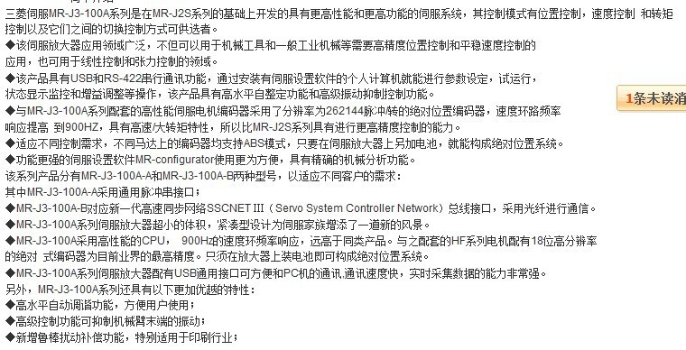 三菱通用交流伺服放大器MR-J3系列是在MR-J2S系列的基础上开发的具有更高性能和更高功能的伺服系统,其控制模式有位置控制,速度控制和转矩控制以及它们之间的切换控制方式可供选者。